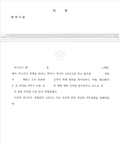 출동한 경찰관은 의뢰인을 말리려고 하였으나, 의뢰인은 경찰관에게 **"씨발, 체포해"**라는 등의 심한 욕설을 퍼붓고는 이번에는 경찰관에게 주먹을 휘두르려고 하였고, 급기야는 경찰관을 손으로 확 밀어서 경찰관이 나동그라지고, 다시 일어난 경찰관이 의뢰인에게 경고를 하자 또 다시 경찰관을 세게 밀어붙여서 경찰관이 뒤로 밀쳐지며 벽에 부딪히는 등, 심각할 정도의 폭행 행위를 경찰관에게 가하였습니다.