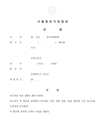 판결 선고 당일, 의뢰인은 떨리는 마음으로 법원에 출석하여 피고인석에 섰습니다. 긴장되는 마음으로 선고가 내려지던 순간, 판사님께서는 **"피고인을 벌금 300만원에 처한다."**고 말씀하시며, 너무나 감사하고 감사하게도 의뢰인에게 벌금형의 선처를 내려주셨습니다.