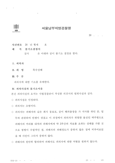 함께 술을 마시던 중 다툼이 벌어지자 화가 난다는 이유로 맥주병으로 동료의 머리를 내리쳐 뇌진탕의 상해를 가한 사건에 대해서 기소유예 처분을 받은 사례